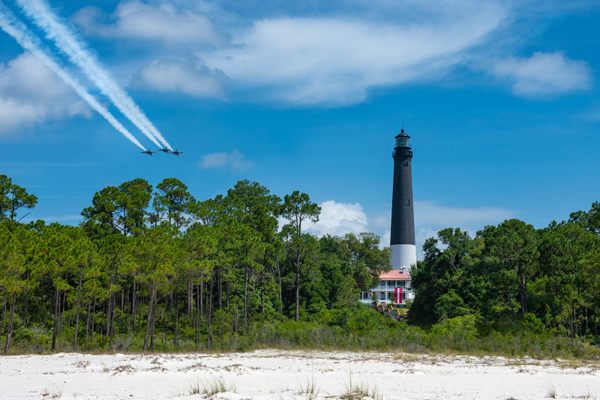 During the Civil War, the lighthouse stood in a uniquely dangerous position. Union forces occupied it early, and Confederate cannons at Fort Barrancas, directly across the bay, fired on it regularly.